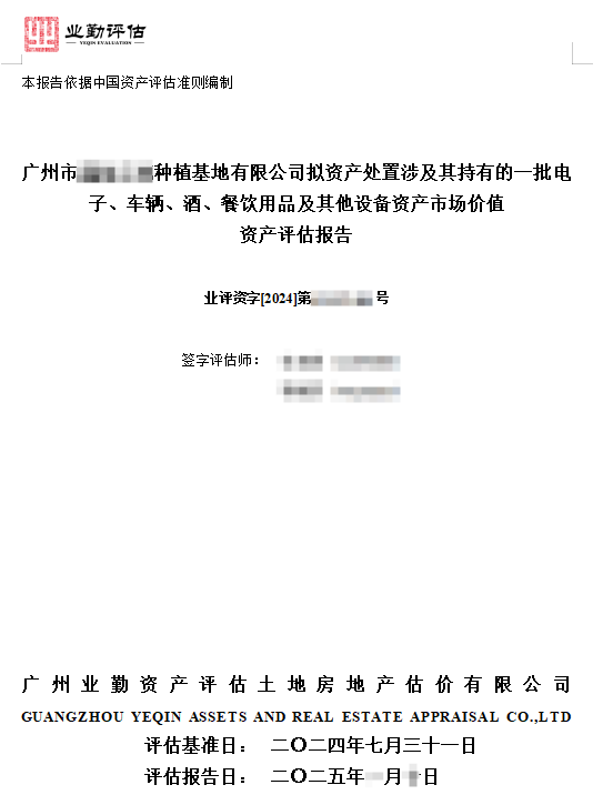 综上所述,本次资产处置评估采用市场法、成本法进行测算。通过严谨的评定估算,业勤评估出具了详细的市场价值评估报告(即《广州市******种植基地有限公司拟资产处置涉及其持有的一批电子、车辆、酒、餐饮用品及其他设备资产市场价值资产评估报告》),明确各资产的估值。报告不仅反映了资产现状,还考虑了处置时的合理成本与区域市场行情,为委托方制定处置方案提供了清晰指引。在广州这样的经济活跃区域,资产处置评估已成为企业资产管理中的常规环节,而专业的广州资产评估机构正是这一环节的核心执行者。