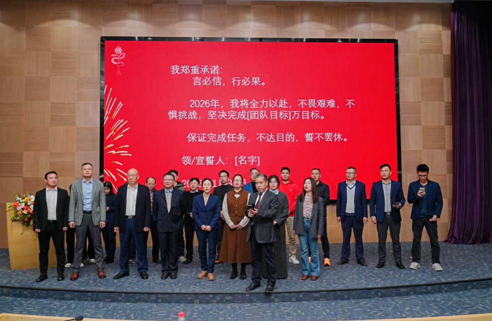 在庄严而激昂的氛围中,公司管理层与各部门经理共同签署了2026年度业绩确认书,并进行了集体宣誓。在董事长何占平的领誓下,全体股东及部门经理郑重承诺:“言必信,行必果!2026年,我将全力以赴,不畏艰难,坚决完成团队目标任务!”