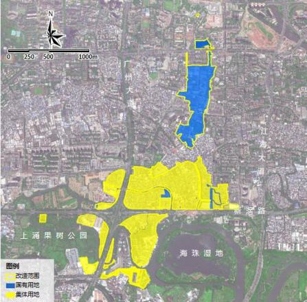 根据2021年公示的基础数据,改造范围现状建设面积258.43万㎡。项目北部有1个机关单位海珠区政府,东南部有1个生态旅游景点海珠湖公园,南部有多个楼盘例如尚东·峰景,西南部有南洲工业区,周围集聚了相关汽车维修类产业,西部、北部集聚较多的纺织城、制衣厂、布匹市场等。项目内部主要是生态用地、城中村用地和汽车产业用地;生态资源有上涌果树公园;产业项目有服装城以及相关产业园区。西、南部有集聚的二手车交易市场、车零件配件、汽车销售等产业。