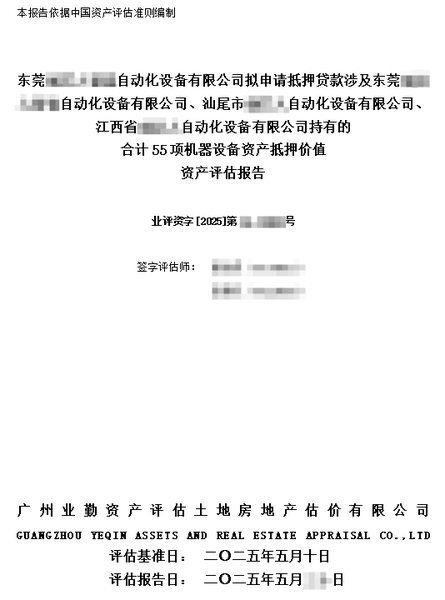 东莞设备评估最终为委托人东莞****自动化设备有限公司提供了科学且具备法律效力的评估报告,助力其顺利申请贷款。在东莞设备评估领域,业勤评估凭借严谨流程和较强的市场适配性,成为企业信赖的合作伙伴。欢迎咨询业勤评估(联系方式:199-2473-8813)获取专业支持。
