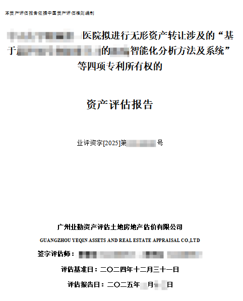 业勤评估通过双模型交叉验证,最终出具专利所有权评估报告《******医院拟进行无形资产转让涉及的"基于******的****智能化分析方法及系统"等四项专利所有权的资产评估报告》。