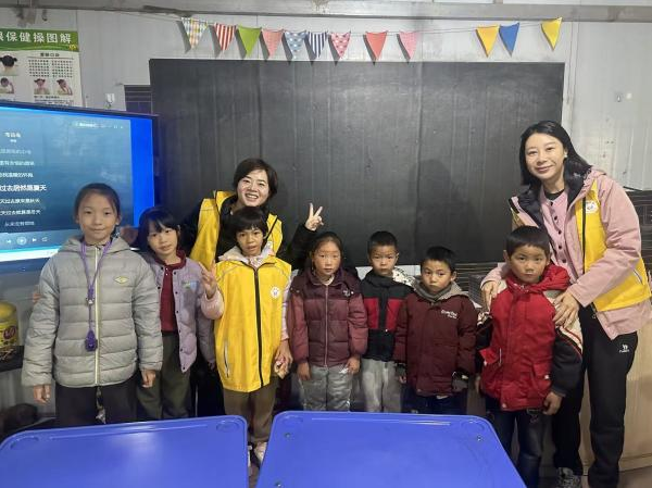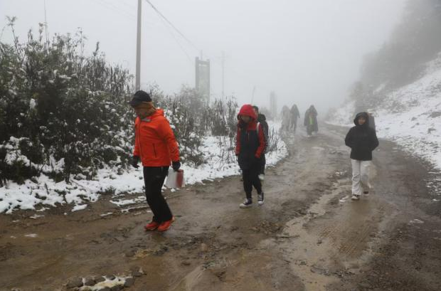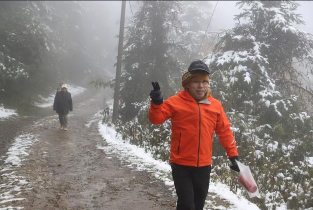 何占平陪孩子们走在泥泞的山路上,周围一片白茫茫,气温降到了零度,迎面的风吹的脸生疼。